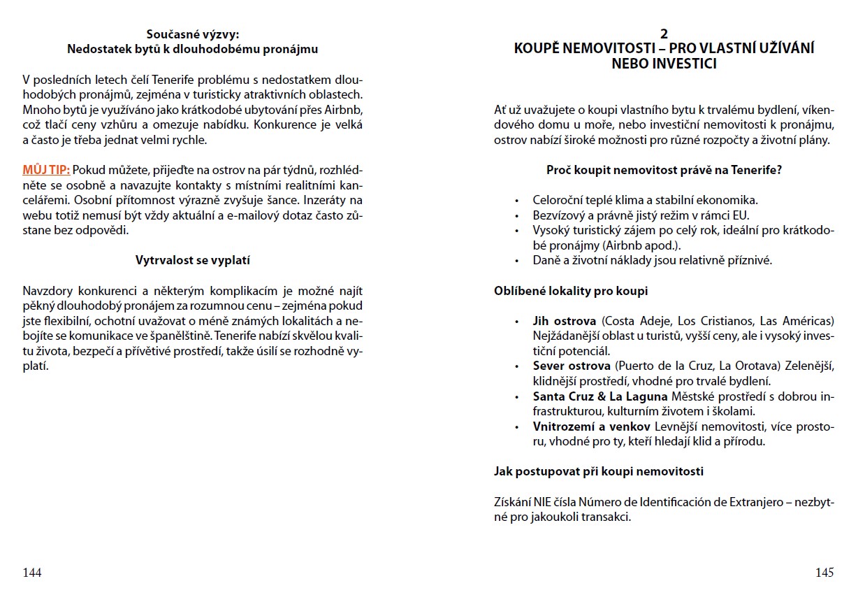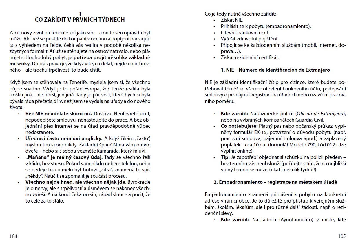 Pokud přemýšlíte o stěhování na Tenerife, tato kniha pro vás bude skvělým průvodcem. Autorka poutavě popisuje celý proces, kterým sama musela projít – od hledání bydlení, přes založení bankovního účtu až po registraci vozidla. Zároveň čtenáři přibližuje reálný život na ostrově, jeho klady i úskalí. Kniha je navíc doplněna o užitečné tipy na gastronomii, pláže a přírodní krásy. Určitě doporučuji!
